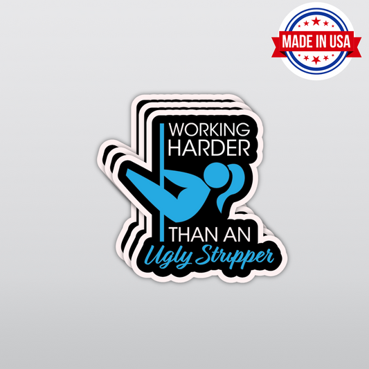 Funny Blue Collar Sticker "Working Harder Than An Ugly Stripper" Adult Humor